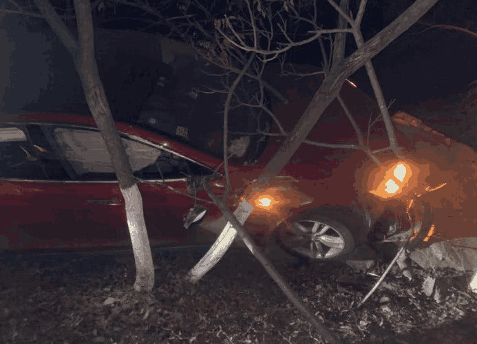 特斯拉Model S冲入山沟,车身被树木包围,车头受损严重,中网和保险杠破碎,甚至脱落,外观显得非常狼狈。但令人惊讶的是,车头部分的车架并未受到严重损伤,驾驶室更是毫发无损。