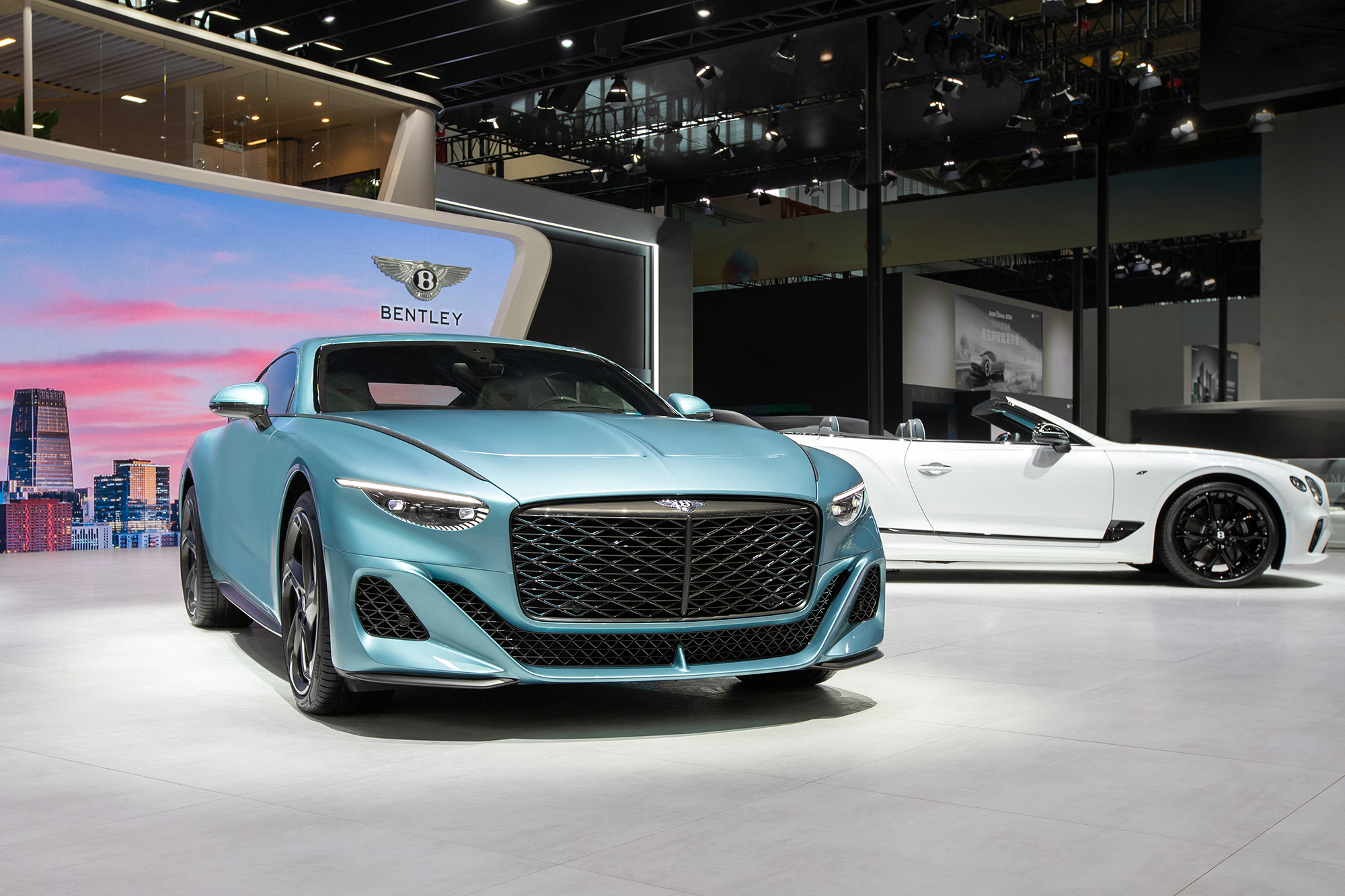 宾利雅度插电混动版在车展的豪华展台上展出。这款车型采用了MULLINER的众多个性化设计,尤其是豪华内饰,给人留下了深刻的印象。车内独特的双色面板设计,成为了引人注目的亮点。