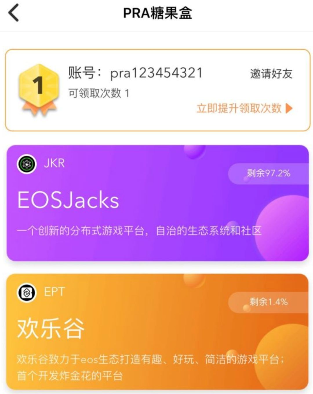 PRA糖果盒是PROCHAIN团队基于EOS平台开发的第一个通证化广告糖果盒DApp。其目的是很清晰的,即在EOS生态项目的初期阶段,通过发放糖果(token)来展示项目并吸引首批用户。这对项目方而言,是一个极好的推广和吸引客户的方式。