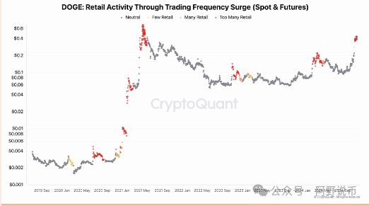 查看过往,狗狗币的发展轨迹显现出一种令人不安的模式。每当零售投资者大量介入不久,其价格便常会出现下滑。例如,2024年5月、2023年1月以及2021年5月都见证了这一现象。由此可知,狗狗币市场呈现出一定的周期性波动。许多经验丰富的投资者据此规律,会选择在这个时期内谨慎交易,甚至选择退出市场。